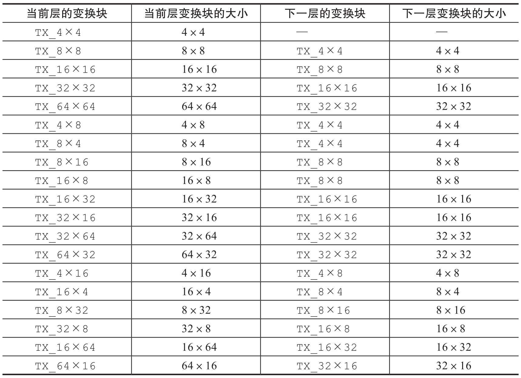 为了进一步捕捉预测残差的空域和频域特性,AV1支持把变换块进一步划分为多个更小尺寸的变换块。在划分过程中,变换块的划分方式由变换块的形状决定。表3-2所示为变换块划分中相邻层之间的映射关系 [11] ,即如何根据当前层变换块的形状和尺寸确定下一层变换块。