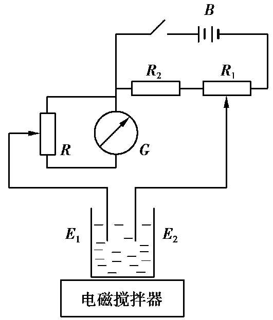 永停滴定法的仪器简单,操作方便,一般仪器装置如图 1.15 所示。图中 E 1 和 E 2 为两个铂电极; R 1 是 2 kΩ的线绕电阻,通过调节 R 1 可得到适当的外加电压; R 2 为 60~70 Ω的固定电阻; R 为电流计的分流电阻,作调节电流计的灵敏度之用; G 为灵敏电流计; B 为1.5 V干电池,作为供给外加低电压的电源。与电位滴定一样,滴定过程中用电磁搅拌器对溶液进行搅拌。通常只需要在滴定时仔细观察电流计的指针变化情况,当指针位置突变时即为滴定终点。