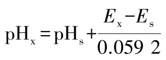 在实际生产中,常利用直接电位法测定溶液的pH值。常用pH玻璃电极为指示电极(接负极),饱和甘汞电极为参比电极(接正极)或直接使用复合电极与备测溶液组成电池,实际测量中,选用pH值与水样pH值接近的标准缓冲溶液进行比较而得到预测溶液的pH。pH值与所测电动势之间的关系为
