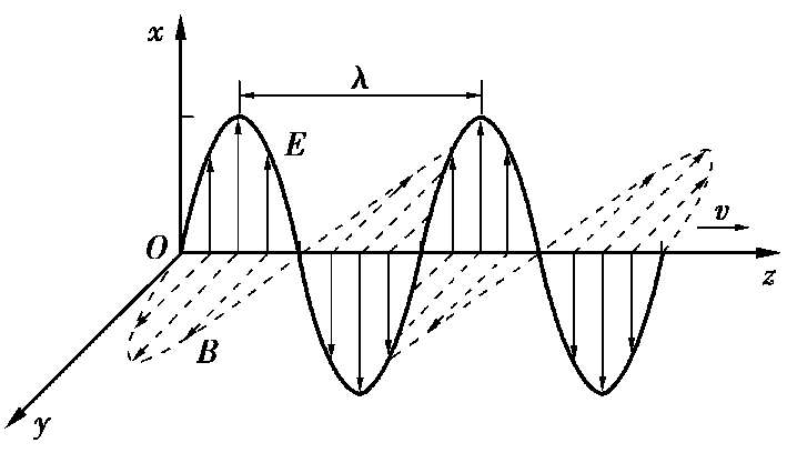 电磁辐射的传播以及反射、折射、散射、衍射及干涉等现象表现出电磁辐射具有波的性质。根据麦克斯韦的观点,电磁波可用电场和磁场两个矢量来描述。如图 2.1 所示,当一束电磁波沿 z 轴方向传播,其电场矢量( E )和磁场矢量( H )相应地在 x 轴方向和 y 轴方向发生周期性变化,且两种矢量均为正弦波。一般用以下参数描述电磁辐射的波动性。