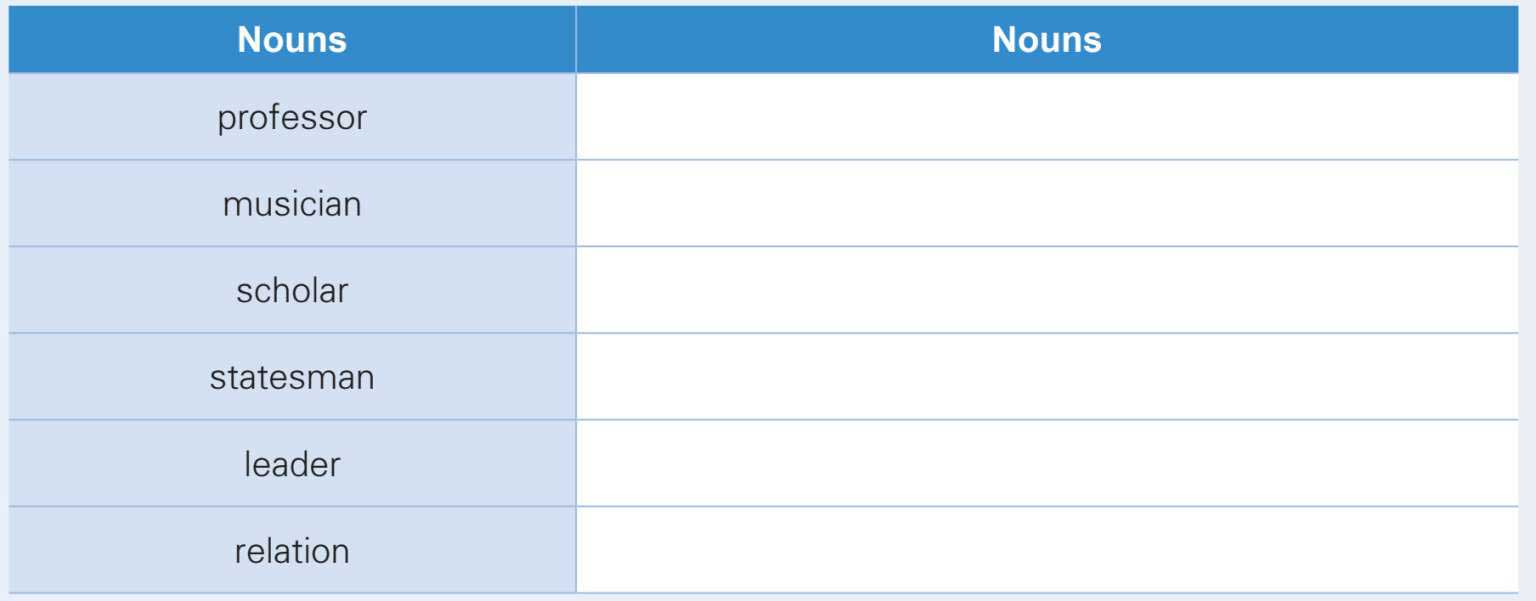 Write out the nouns derived from the following noums and adjectives and fill in the blanks in the sentences below with them. (写出由下列名词和形容词派生出的名词,并根据句意填写相关的词语。)