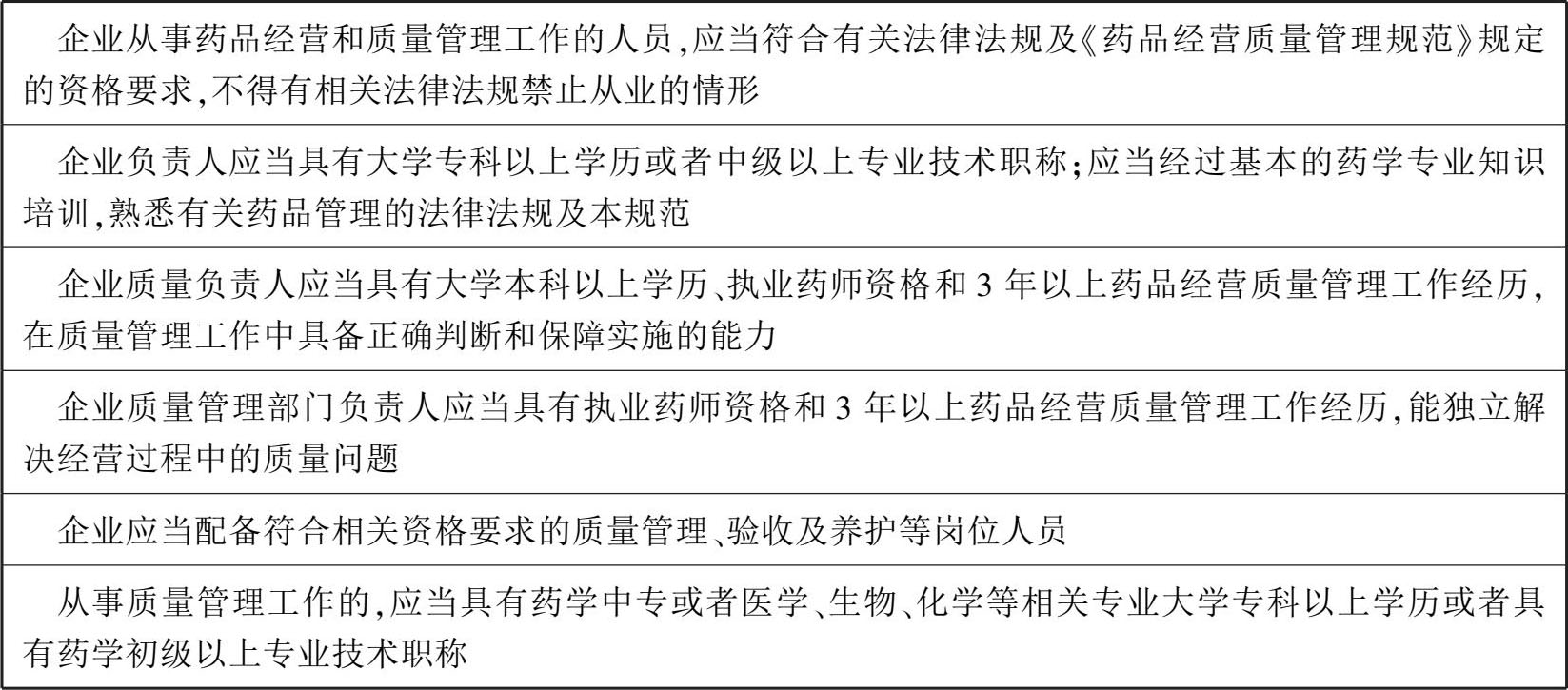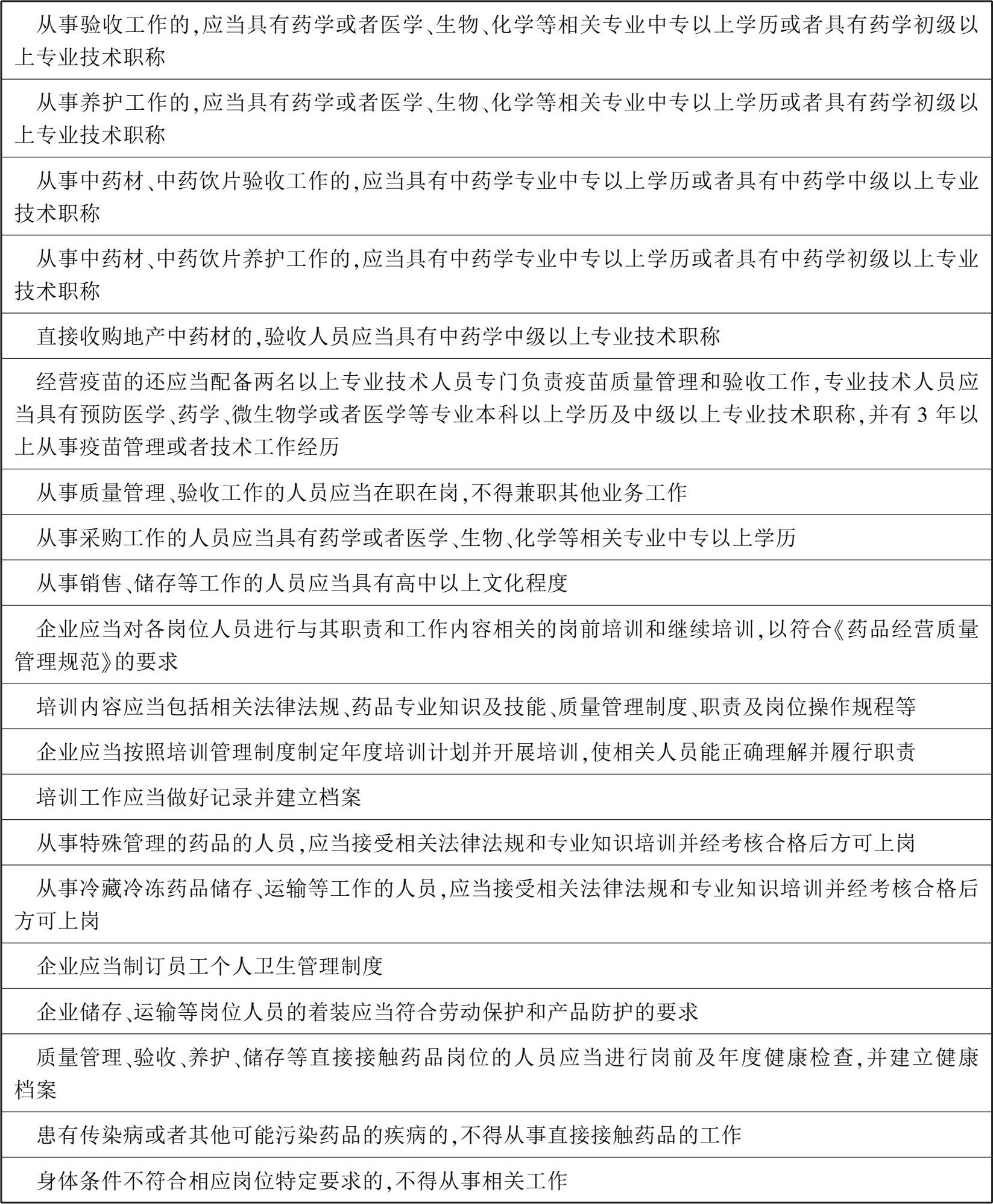 对从事药品经营和质量管理工作人员法定资格的限定,一是要符合法律法规及《药品经营质量管理规范》规定的资格要求,二是不得有相关法律法规禁止从业的情形。依据《药品经营许可证管理办法》规定:企业法定代表人、企业负责人、质量负责人不得有《中华人民共和国药品管理法》以下简称(《药品管理法》)第七十五条、第八十二条规定的情形。