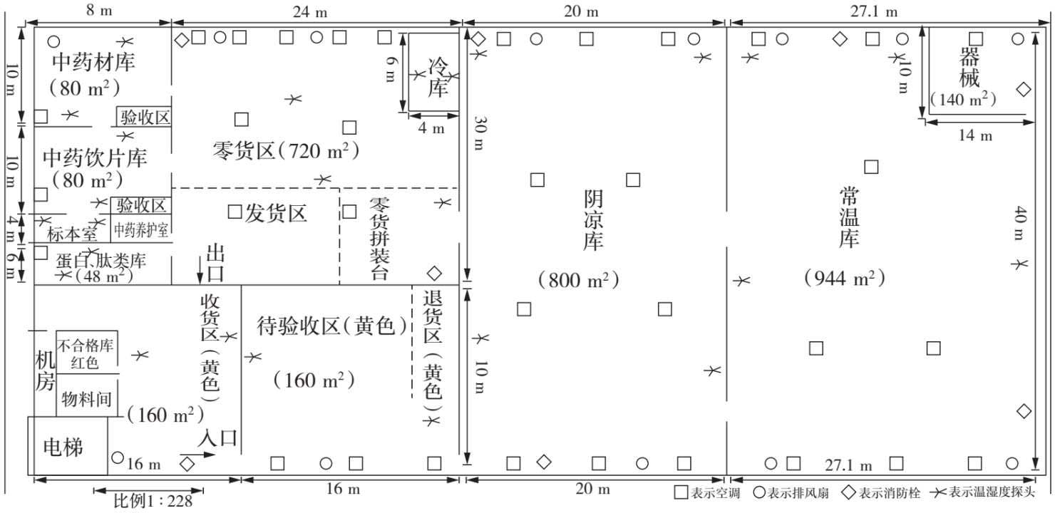 根据药品的理化性质不同所需储存温湿度条件的不同,可将药品仓库分为冷库(2~10 ℃)、阴凉库(20 ℃以下)、常温库(10~30 ℃)3 种类型。药品仓库的相对湿度为35%~75%。