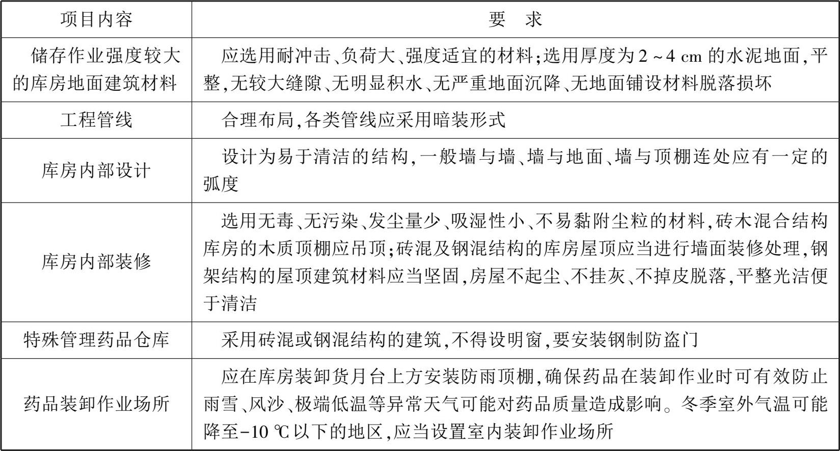 新版GSP中第四十六、一百五十条对药品批发企业和零售企业的库房作出了具体的要求。对新开办的药品经营企业,其选址、硬件设计、建筑施工、装修等均应严格遵循新版GSP要求进行合理布局、规划或进行整改以达到新版GSP要求。仓库建筑与装修要求见表 4.1。