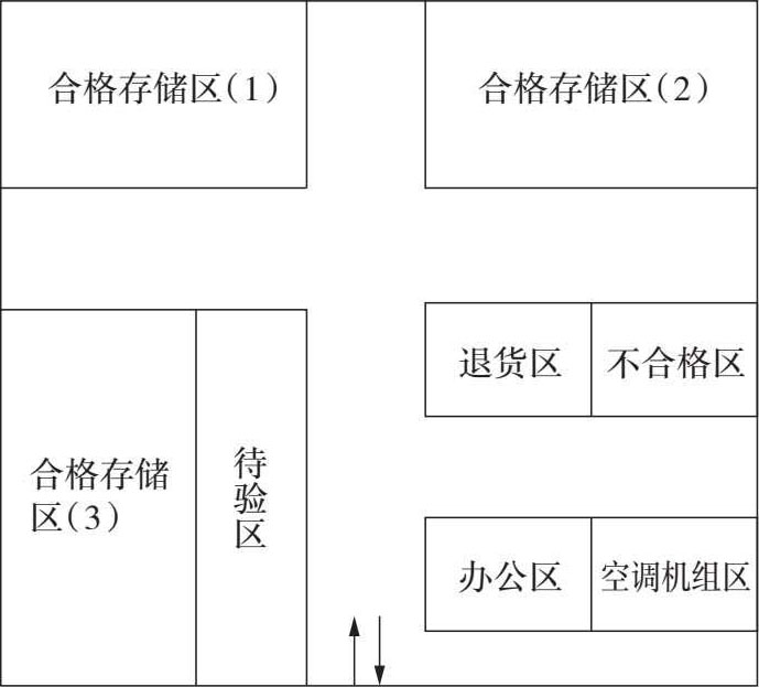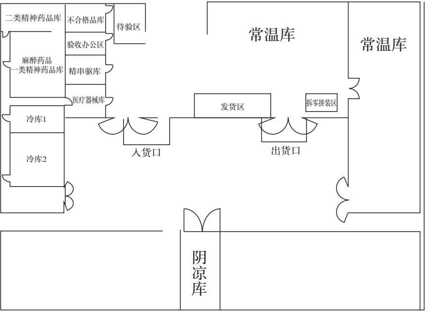在新版GSP中,增加了验收、发货、退货的专用场所及不合格药品专用存放场所。根据药品的质量管理状态要求,应将仓库划分为:待验库(区)、合格品库(区)、发货库(区)、不合格品库(区)、退货库(区)和中药饮片零货称取库(区)。药品批发企业经营规模较大,库房数量较多,可以按库进行划分管理;企业经营规模较小如药品零售企业,库房面积有限,可在库房内实行划区管理;企业也可以实行库房分类与库内划区的方式进行管理。库房各类库或区的划分方式,应由企业经营规模及经营特点决定。库房标识所采用的颜色应符合药品仓储色标管理的规定,标明所储存药品的质量管理状态,杜绝库存药品的存放差错。根据色标区分标准,合格品库(区)、发货库(区)、中药饮片零货称取库(区)为绿色;不合格品库(区)为红色;质量状态不明确的待验库(区)、退货库(区)为黄色。药品仓库平面示意图如图 4.1 所示。
