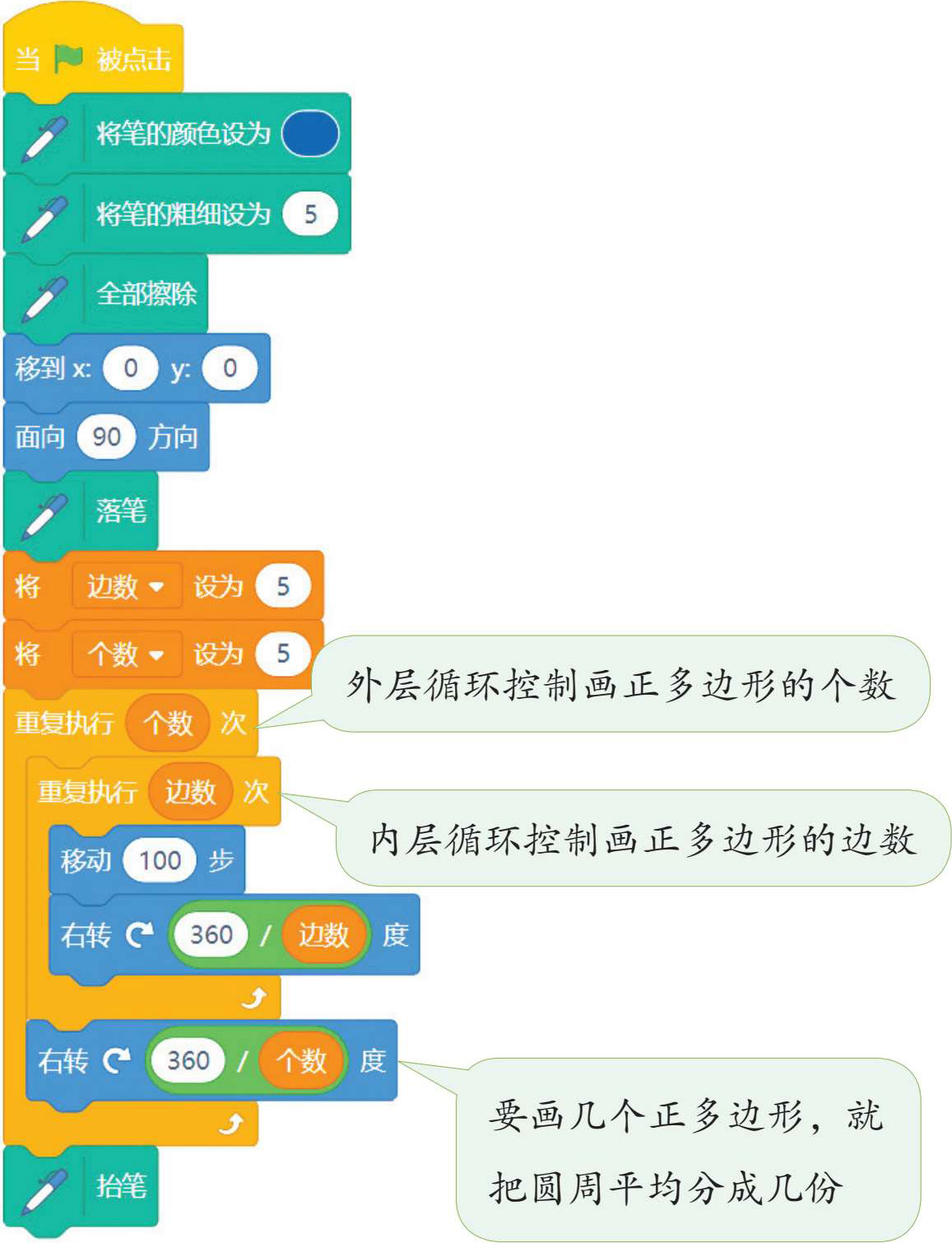在画正多边形的循环结构外嵌套另一个循环结构可以画出神奇的旋转图。