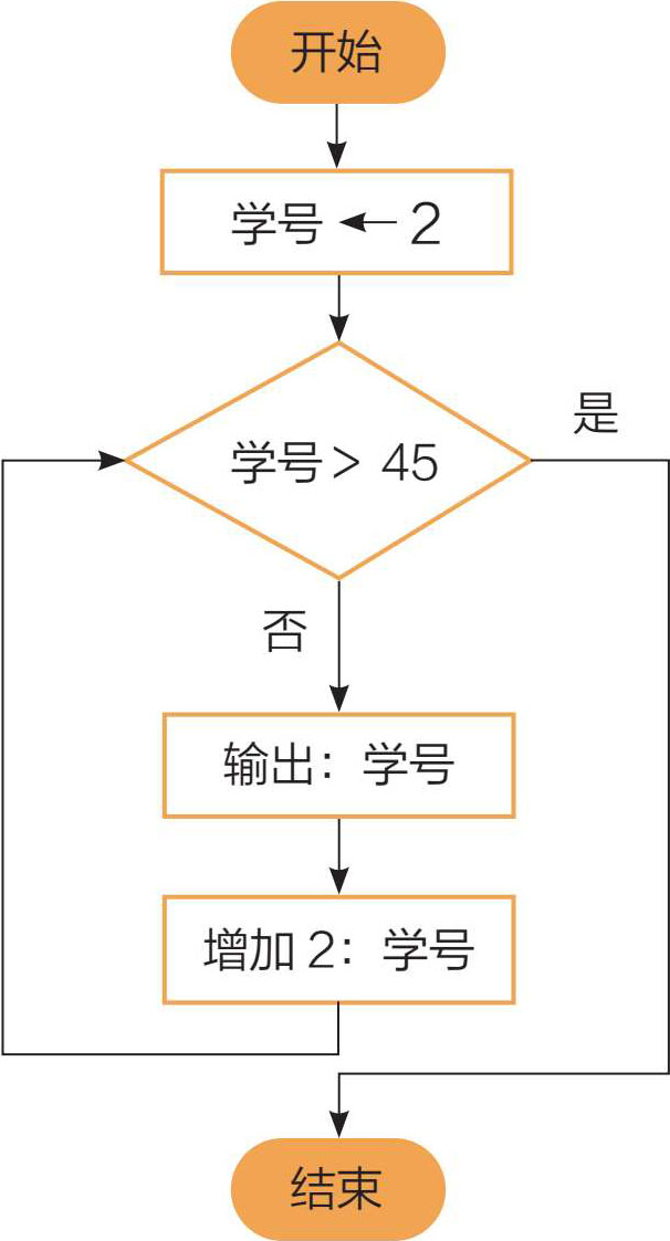 1.在上面的流程图中,循环的退出条件是____________,“学号”的初始值为____________,每次重复后它的值增加_____________。