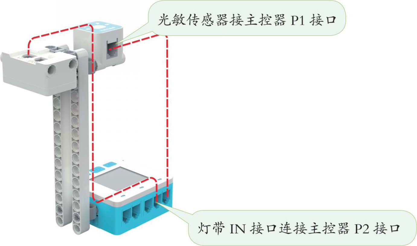 连接硬件,用信号连接线将灯带接到主控器P2接口,光敏传感器接到主控器P1接口。