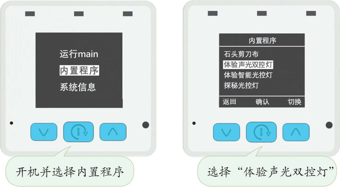 按下主控器“右键”切换选项,选择“内置程序”,通过“中键”确认选项,然后再选择“体验声光双控灯”程序。