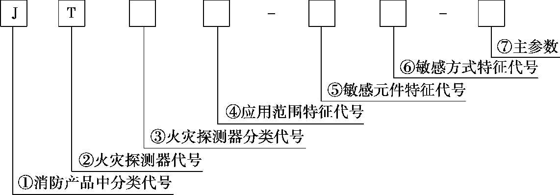 火灾报警产品种类较多,附件更多,但都是按照国家标准编制命名的。国标型号均按汉语拼音字头的大写字母组合而成,只要掌握规律,从名称就可以看出产品类型与特征,如图2.13所示。