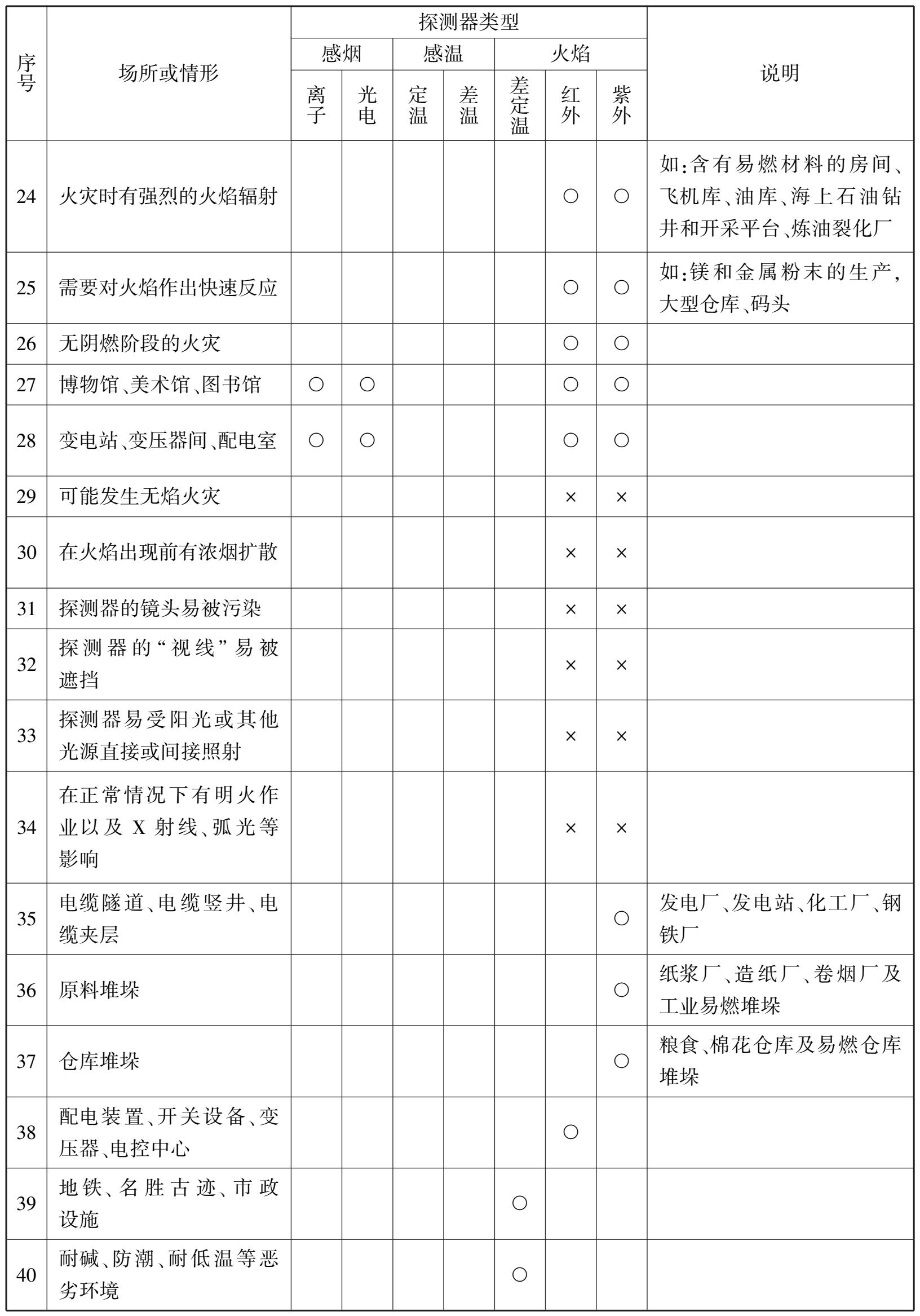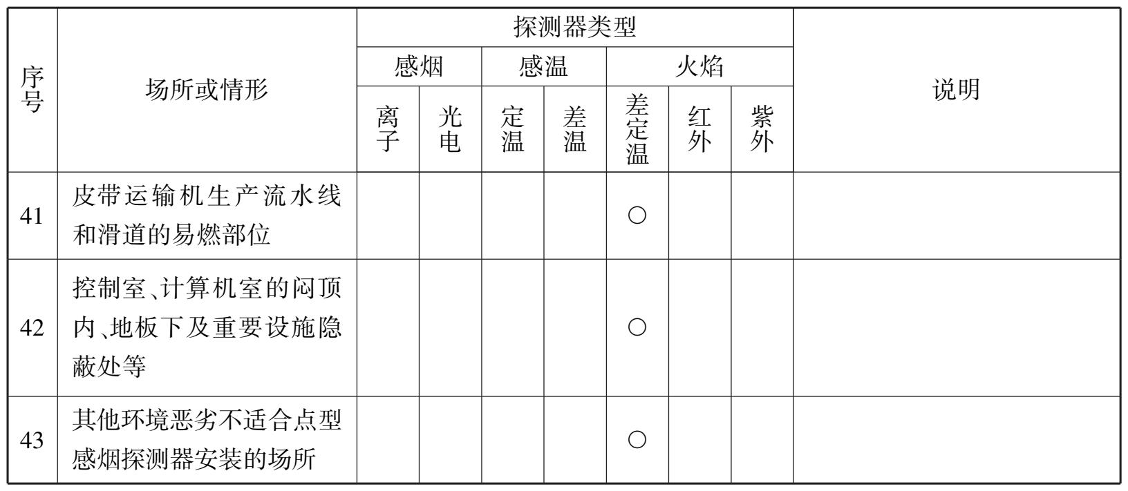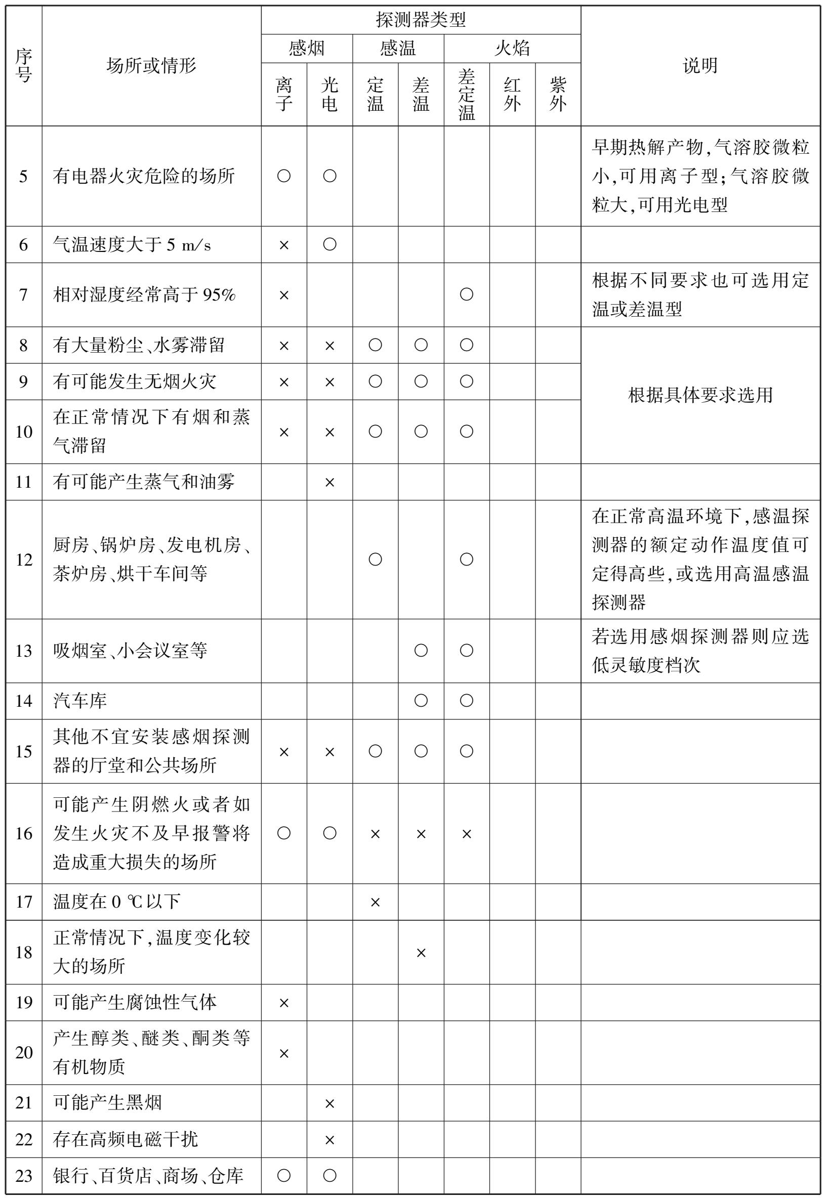 ⑫污物较多且必须安装感烟火灾探测器的场所,应选择间断吸气的点型采样吸气式感烟火灾探测器或具有过滤网和管路自清洗功能的管路采样吸气式感烟火灾探测器。点型火灾探测器的适用场所见表2.6。