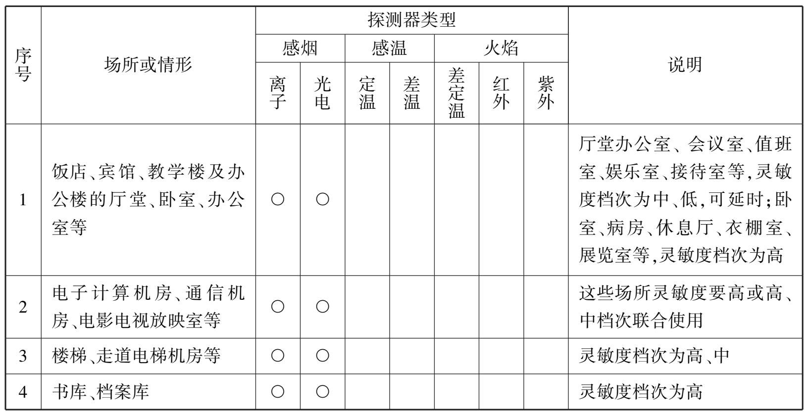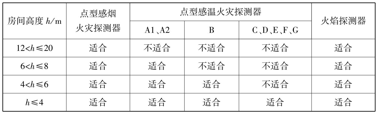 房间高度不同,选择点型火灾探测器的类别也不同,见表2.7。