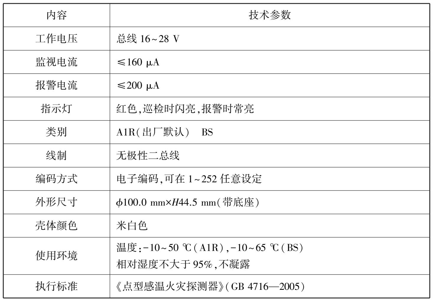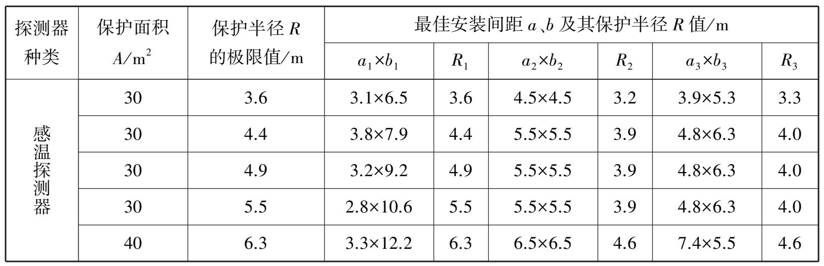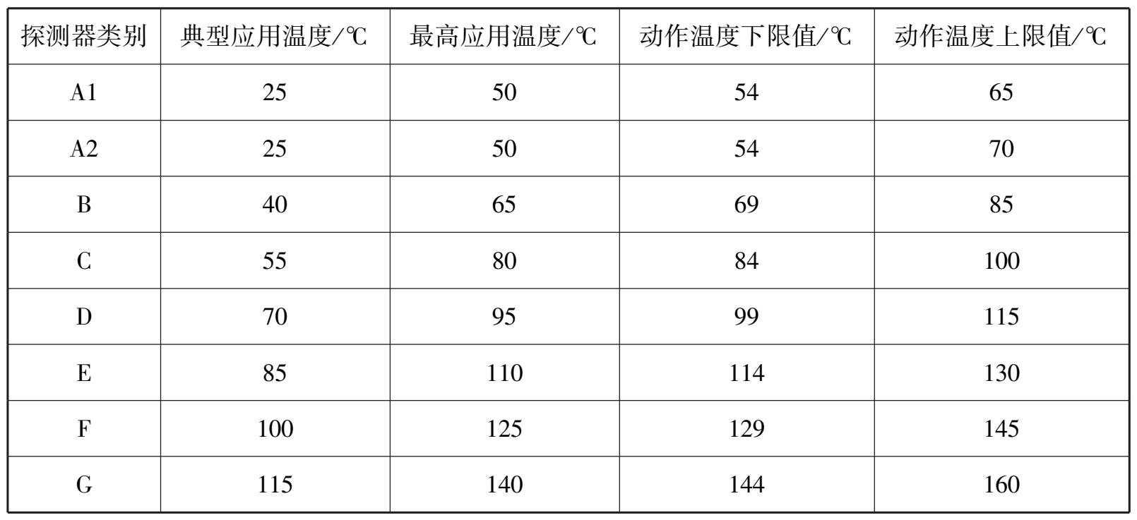 注:表中A1、A2、B、C、D、E、F、G为点型感温探测器的不同类别,其具体参数应符合《火灾自动报警系统设计规范》(GB 50116—2013)中的相关规定,见表2.8的规定。