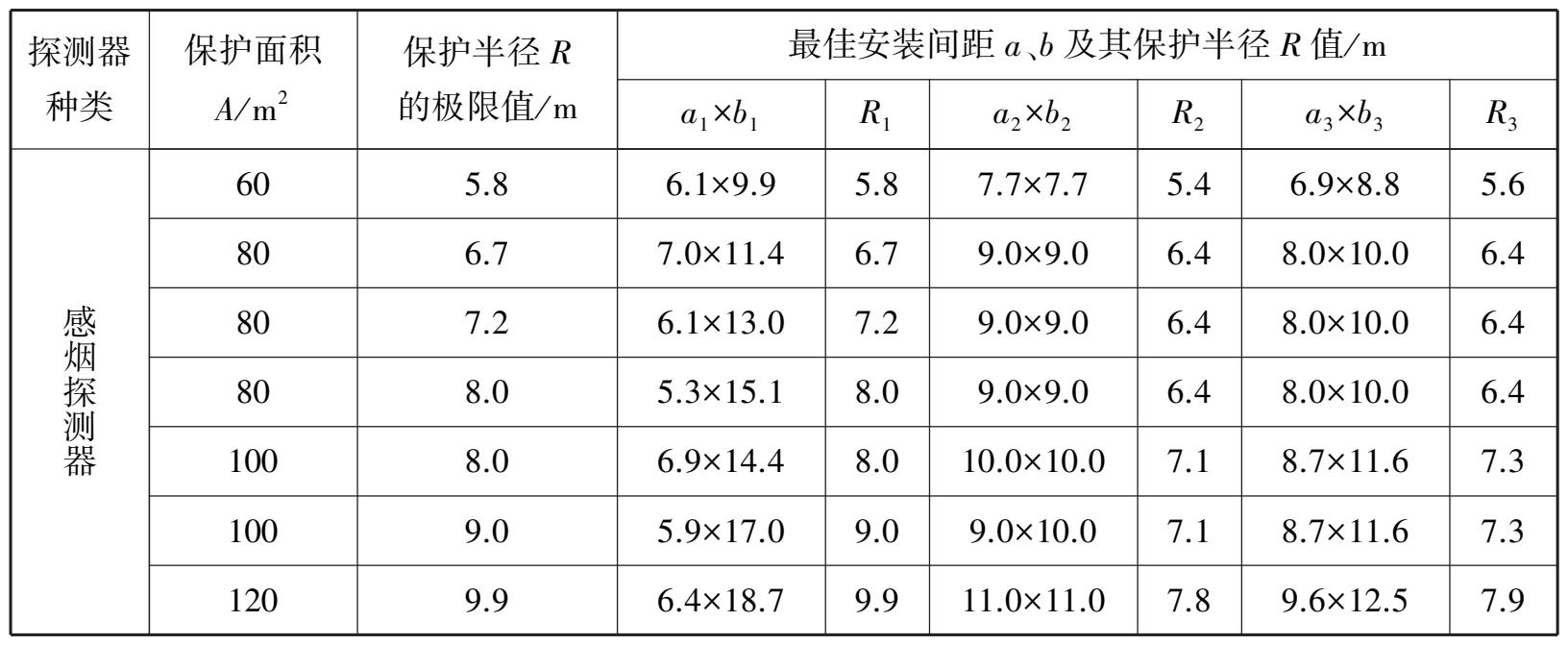 b.查表法。查表法是指根据探测器种类和数量直接从表2.10中查到适当的安装间距 a 和 b 值布置即可。