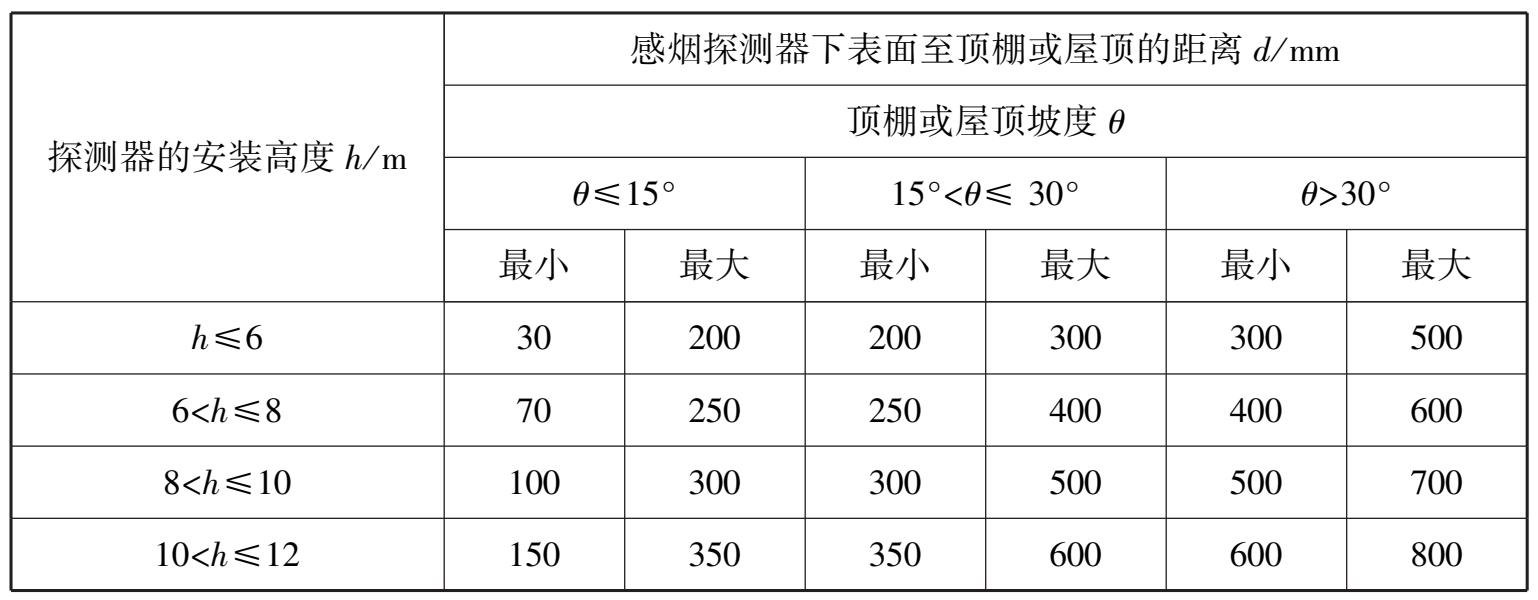 表2.13 感烟探测器下表面至顶棚或屋顶的距离
