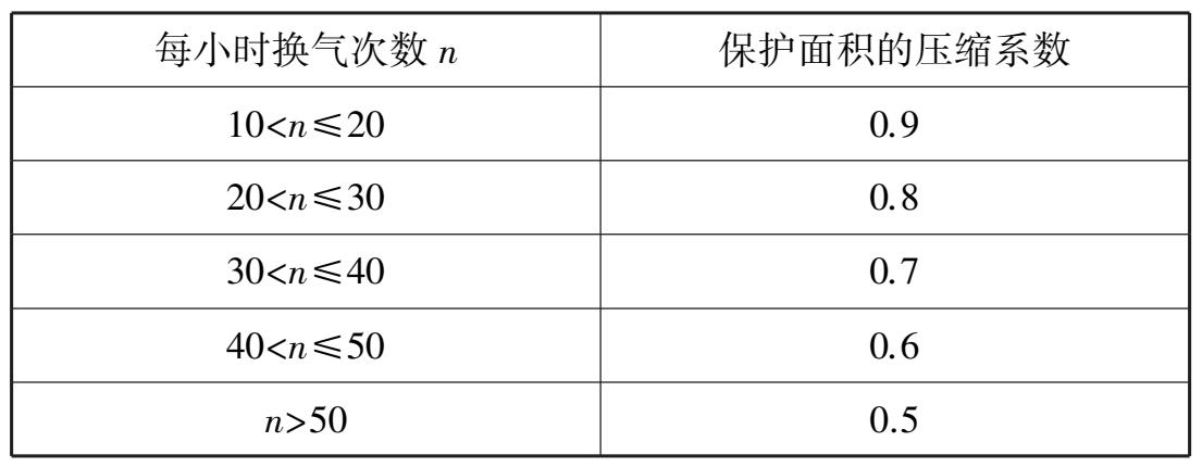 通风换气对感烟探测器的面积有影响,在通风换气房间,烟的自然蔓延方式被破坏。换气越频繁,燃烧产物(烟气体)的浓度越低,部分烟被空气带走,导致探测器接受烟量的减少,或者说探测器感烟灵敏度相对降低。常用的补偿方法有两种:一是压缩每个探测器的保护面积;二是增大探测器的灵敏度,但要注意防误报。感烟探测器保护面积的压缩系数见表2.11。可根据房间每小时换气次数( n ),将探测器的保护面积乘以一个压缩系数。