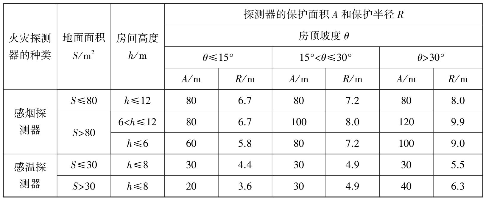 A ——一个探测器的保护面积,m 2 ,指这个探测器能有效探测的地面面积,由于建筑物房间的地面通常为矩形,因此所谓“有效”探测器的地面面积实际上是指探测器能探测到矩形地面的面积。探测器的保护半径 R (m)是指一个探测器能有效探测的单向最大水平距离,感烟、感温探测器的保护面积和保护半径见表2.9。