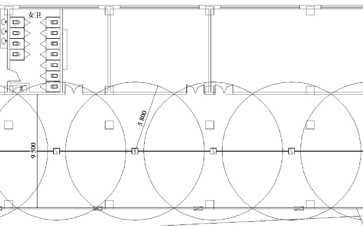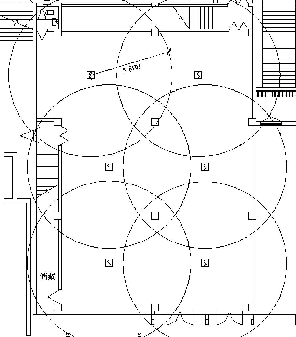 点型探测器布置完成后,可以采用半径法对布置的合理性进行验证。要保证探测区域内所有地面都在探测器保护半径以内,如图2.48所示。