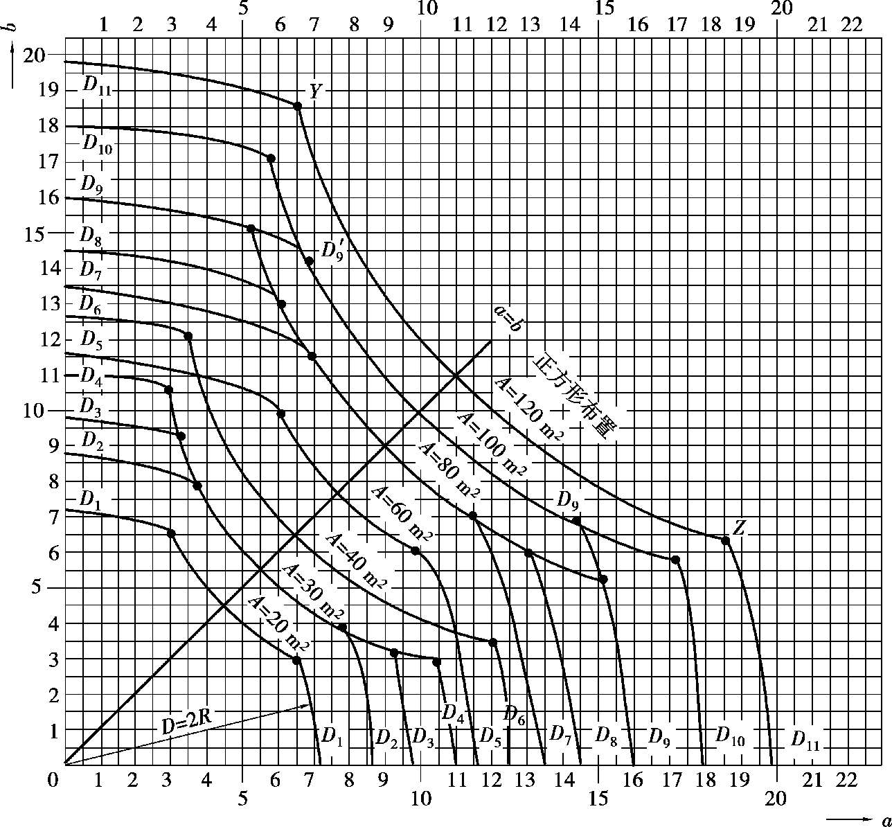 a.计算法:根据从表中查得的保护面积 A 和保护半径 R ,计算直径 D = 2 R ,根据所算 D 值大小对应的保护面积 A ,在图2.45中曲线粗实线上取一点,此点所对应的数即为安装间距 a 、 b 值。在布置中,实际值不应大于查得的 a 、 b 值。