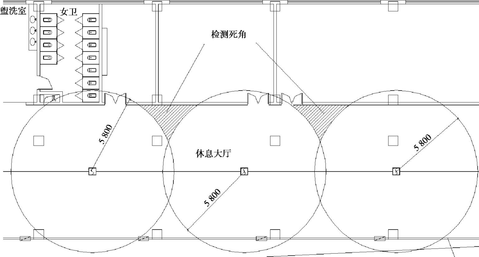 在满足计算的前提下,当探测器的探测存在死角时,就必须增加探测器的数量到不存在死角时为止,如图2.49、图2.50所示。