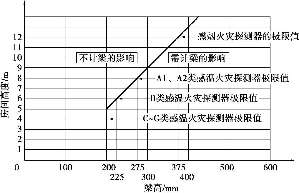 b.当梁突出顶棚的高度为200~ 600 mm时,应按《火灾自动报警系统设计规范》(GB 50116—2013)中附录F、附录G确定梁对探测器保护面积的影响和一只探测器能够保护的梁间区域的个数。
