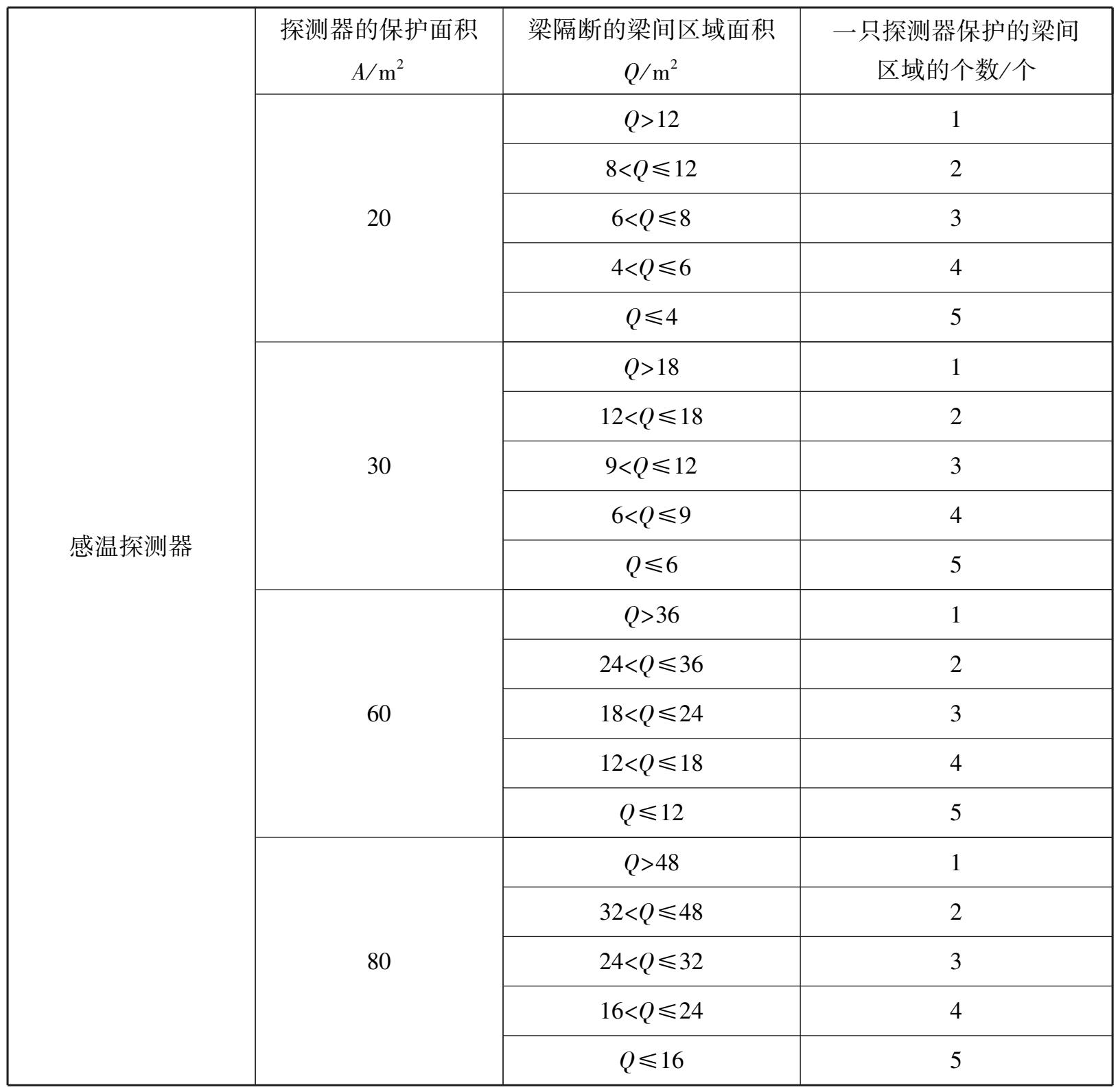 表2.12 按梁间区域面积确定一只探测器保护的梁间区域的个数
