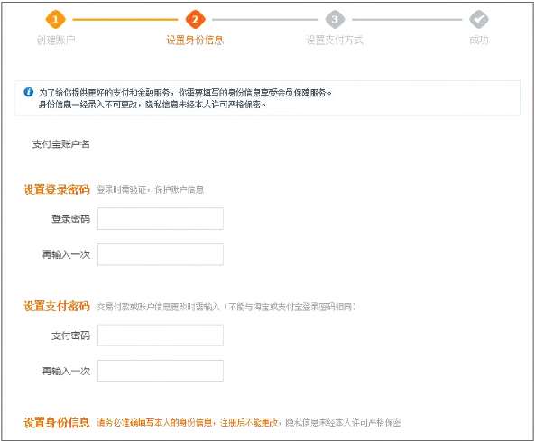 ②设置身份信息。设置安全的登录密码及支付密码,如图1-8所示。