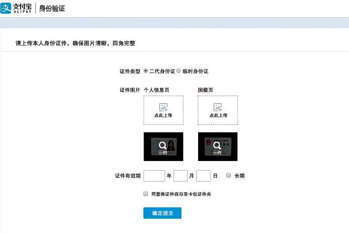 ④完成支付宝实名认证需上传本人身份证正、反两面的照片,并填写证件的有效期,如图1-13所示。