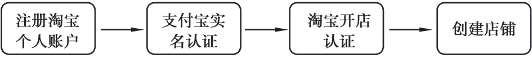 公司决定“乐享办公用品旗舰店”选择在淘宝电商平台申请为个人店铺。淘宝网规定,凡年满18周岁未满65周岁、办理了本人身份证且具有持本人身份证办理的银行卡、了解电子商务模式及运作原理、有网络营销意识的公民,均可在淘宝网站上申请开店。淘宝网站申请个人店铺主要有以下4个流程,如图1-2所示。