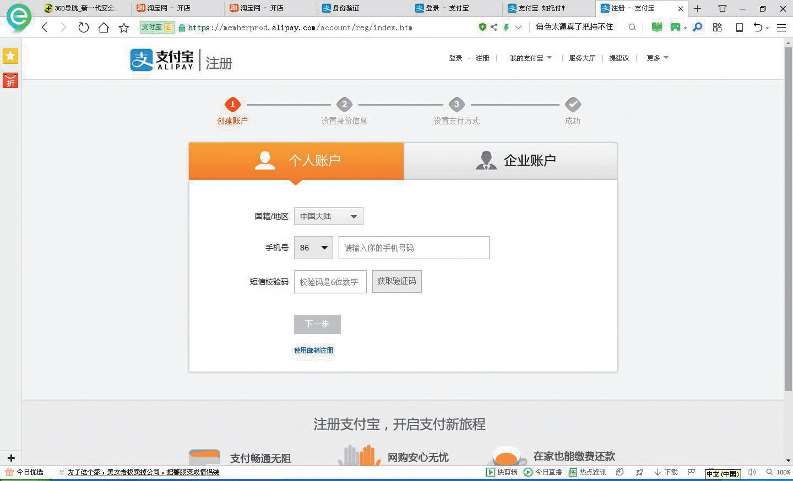 ①打开支付宝官方网站(www.alipay.com),单击“立即注册”按钮,进入支付宝注册页面填写手机号码和短信验证码,如图1-7所示。