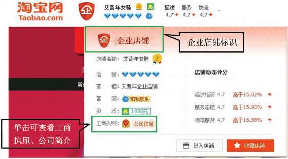 淘宝企业店铺在功能上优化了开店的流程,能够更快捷地开店,在前台展示上,有订制的网店套头和宝贝详情页,搜索、下单页、购物车、已买到的宝贝、企业店铺的标识也是全链路展现,使消费者能一目了然地知道这是企业店铺。企业店铺在商品发布数量、橱窗位的数量、旺旺子账号的数量等方面都有一定的权益。在直通车上报名,对企业店铺的信用等级要求也更低。企业店铺的信息页面如图1-17所示。