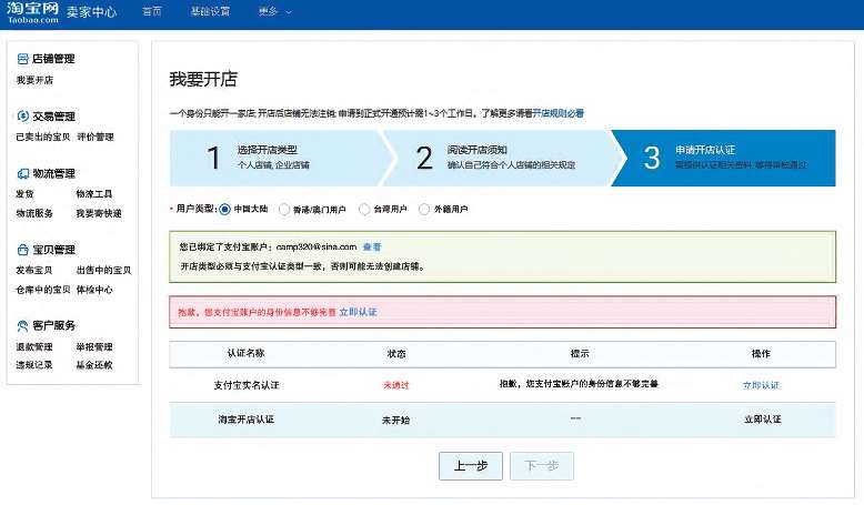 ③这里可以看到,如果要成功开店,需要完成两项认证:支付宝实名认证和淘宝开店认证,如图1-12所示。