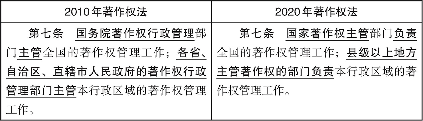此次调整也是和2018年《深化党和国家机构改革方案》(以下简称《机构改革方案》)相互统一呼应。原《著作权法》第七条规定:“国务院著作权行政管理部门主管全国的著作权管理工作;各省、自治区、直辖市人民政府的著作权行政管理部门主管本行政区域的著作权管理工作。”修改后的《著作权法》第七条规定:“国家著作权主管部门负责全国的著作权管理工作;县级以上地方主管著作权的部门负责本行政区域的著作权管理工作。”全国的著作权管理工作主管部门由“国务院著作权行政管理部门”变更成“国家著作权主管部门”;本行政区域的著作权管理工作主管部门由“各省、自治区、直辖市人民政府的著作权行政管理部门”变更成“县级以上地方主管著作权的部门”。