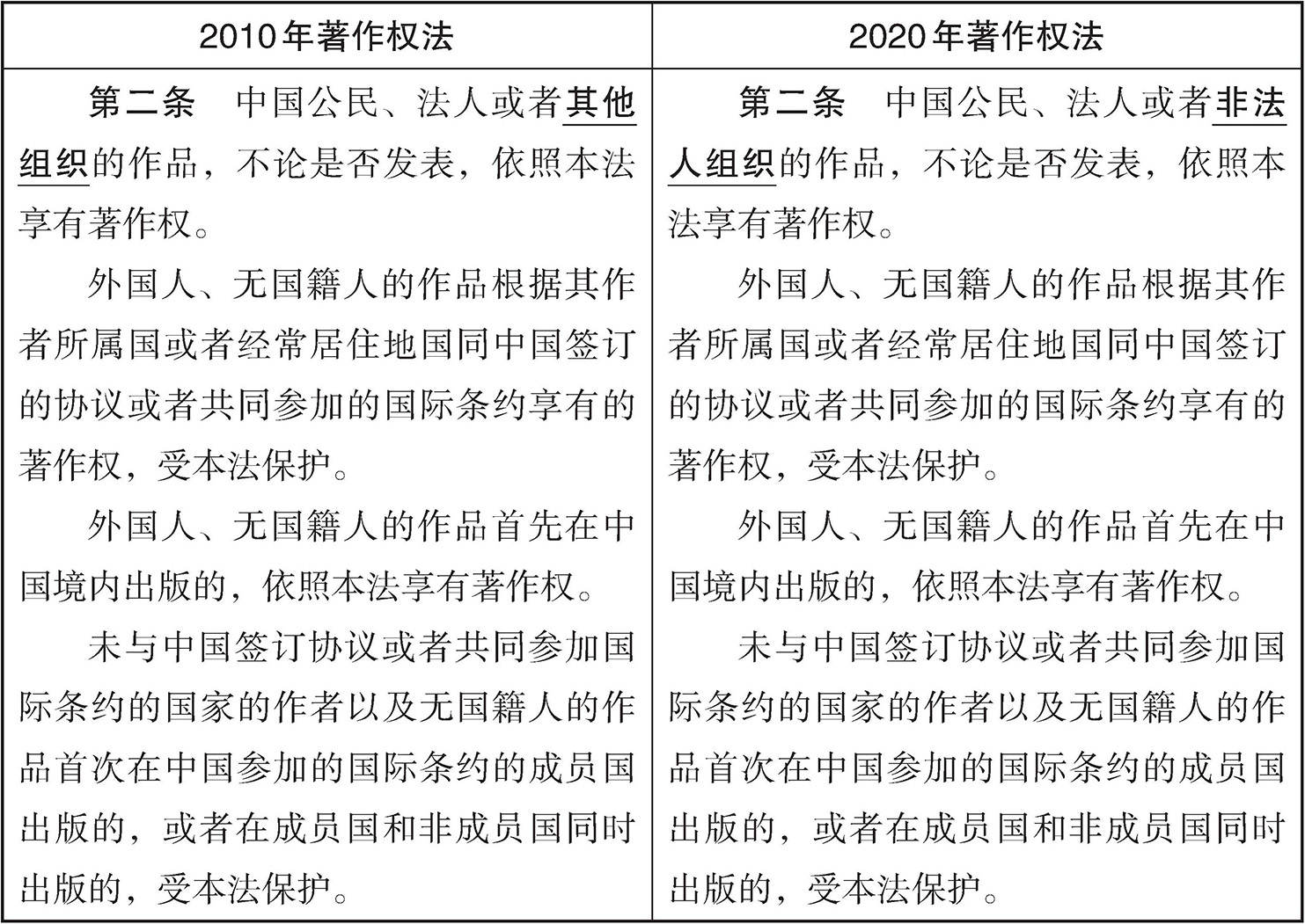 2010年《著作权法》第二条第一款规定“中国公民、法人或者其他组织的作品,不论是否发表,依照本法享有著作权。”2020年《著作权法》将2010年《著作权法》第二条第一款中的“其他组织”修改为“非法人组织”。2021年1月1日起施行的《民法典》第二条规定,民法调整平等主体的自然人、法人和非法人组织之间的人身关系和财产关系。根据上述规定,我国民事基本法律打破了传统民法自然人与法人二元分立的结构,首次明确了非法人组织的民事主体地位,从而将自然人、法人之外的其他社会组织纳入调整范围,更为广泛、周延与系统地调整各类主体之间的民事法律关系。根据《民法典》第一百零二条的规定,非法人组织是不具有法人资格,但是能够依法以自己的名义从事民事活动的组织。为与《民法典》规定的自然人、法人和非法人组织三类民事主体保持一致,我国2020年《著作权法》第二条、第九条、第十一条、第十二条、第十八条、第二十一条、第二十三条、第二十四条统一采用了“非法人组织”的表述,不再采用“其他组织”的表述,实现了与《民法典》的衔接。