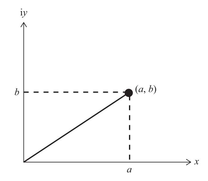 图3–6复平面亦称阿甘平面,它包括水平的实数轴和竖直的虚数轴。在这个平面中,点( x , y )代表复数 x +i y 。图中展示了由点( a , b )代表的复数 a +i b