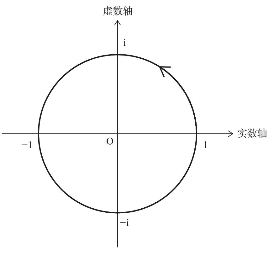 你如果将图3–4中单位圆的概念叠加在图3–6的复平面上,就会得到图3–7,一个以实数轴和虚数轴的原点为中心的单位圆。数字+1对应于 θ =0,i对应于 θ =π/2或90°,–1对应于 θ =π或180°,–i对应于 θ =3π/2或270°。(你也可以沿逆时针方向旋转,则令–i对应于 θ =–π/2或–90°,以此类推。)但下面才是精彩的部分。如果你将1沿圆周移动到i,你就让它旋转了90°。换言之,旋转90°将数字1变成了数字i所在的位置,如同你写出1×i=i时一样。现在,将i旋转90°就得到了–1,如同i 2 =–1一样。乘上虚数似乎确实等价于一次简单的旋转。所以,复平面的奇妙之处就在于,它展示了虚数是如何与实数产生联系的,即通过几何旋转。