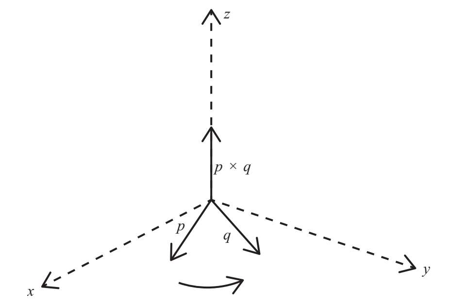 图4–2叉乘的右手定则。如果你将右手四指与拇指垂直,从 p 的箭头方向朝着 q 的箭头方向弯曲,即本例中的逆时针方向,则你的拇指所指方向就是 p × q 的方向:指向上方,即 z 的正向。要找到 q × p 的方向,你需要翻转右手,以顺时针方向弯曲四指,这时你的拇指将指向下方,z的负向。这时, p 和 q 位于 x-y (水平)平面内。但无论在哪个平面内,它们的矢量积都与该平面垂直