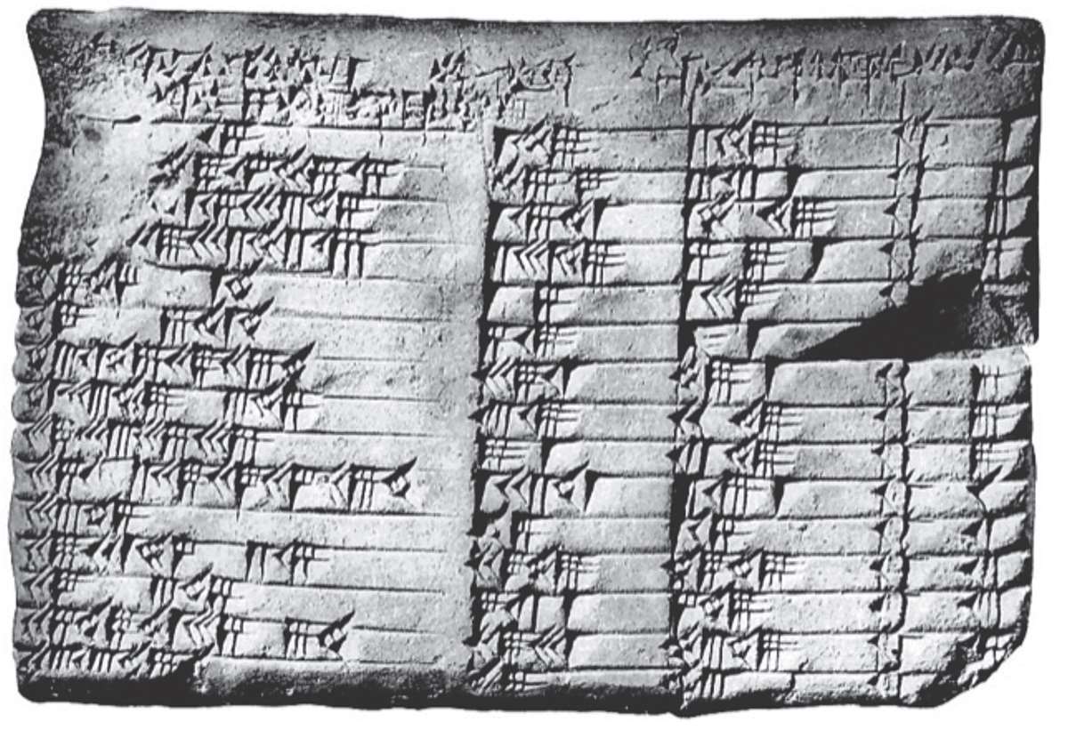 至于一些更复杂的涉及早期数字和数学的泥板(包含乘法表),可以追溯到将近4000年前。这些东西的历史如此悠久,十分令人惊讶。当然,你需要掌握加法和乘法运算技巧,才能执行基本的经济任务。历史学家已经对这些早期任务的性质有所洞察,因为它们也被记录在那些泥板上。值得注意的是,一些最古老的文献列出了有关正方形或矩形地块的边长及面积表格,这种表格式布局后来演变为数学矩阵,简单的信息列表将演变成矢量。稍后,我们会在所有这些数学演变中选取更多的内容进一步讨论。它们将告诉我们,从简单的会计列表发展到能建模如此复杂的事物,比如电磁波或支撑量子计算机的量子比特,数学家做过何种努力。与此同时,这些古老的表格对于计算潜在的粮食收成、种子需求、耕种土地所需的劳动力数量及要支付的工资和税收至关重要。任何大型社会都需要利用这种工具,去生产与分配食物及其他必需品。 [3]
