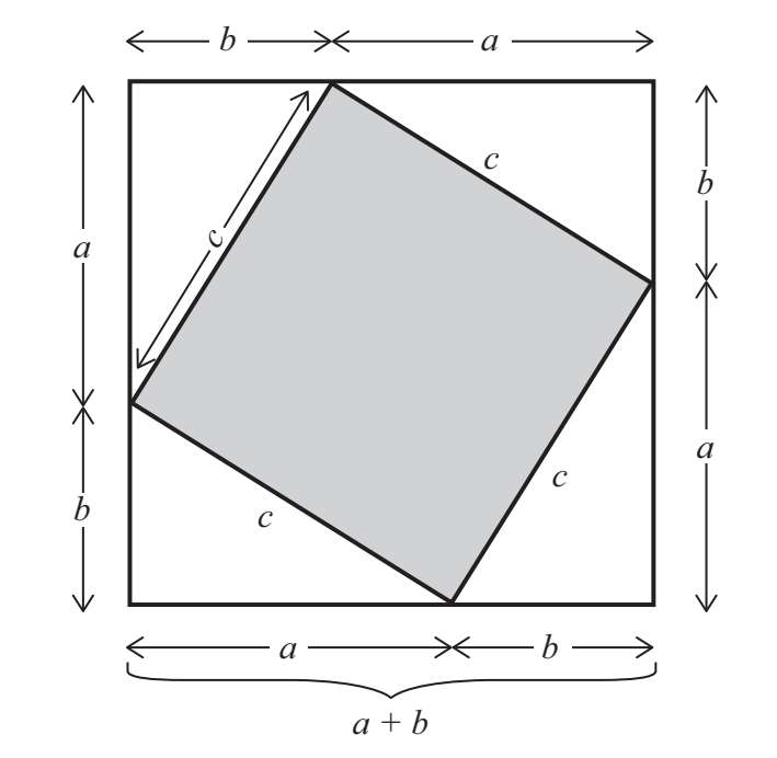 图1–1毕达哥拉斯定理的证明。4个全等直角三角形分置于大正方形的4个角上,这个大正方形的边长为( a + b ),阴影部分的正方形面积 c 2 即为大正方形的面积( a + b ) 2 减去4个直角三角形的面积(4×ab/2)。因此, c 2 =( a + b ) 2 –2 ab = a 2 + b 2