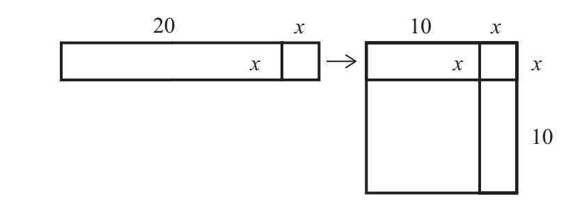 比如,我提到花剌子米曾用“配方法”解二次方程。其实,这是一个起源于4000年前的问题。历史记录显示,该问题可以追溯到当年的楔形文字泥板,它们是与花剌子米同样居住在现代伊拉克所在地区的数学家制作的。这些古代的美索不达米亚人通过字面意义上的“配平方”求解二次方程。下面是当时一个典型的教学问题:“将正方形的一边长增加20后面积变为21,那么正方形的面积是多少?” [13] 这类问题及其解决方法与今天学校教授的内容类似,只不过在4000年前,这一问题的答案完全是用几何方法推导出来的。首先,画一个边长为 x (用现代符号表示)的正方形,在它旁边再画一个大小为20和 x 的矩形。现在,把这个额外的矩形分成两个相等的小矩形,并把它们分别置于正方形的左侧和下方,将其补成一个新的更大的正方形,如图1–2所示。
