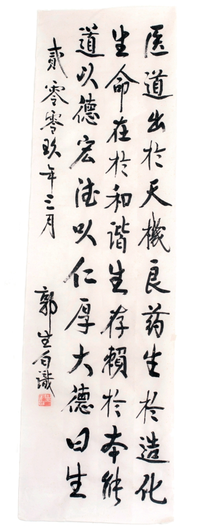 中医乃人体生命科学。医道出天机,良药生造化。生存在和谐,大道法自然。读书在明理,临床必用心。贫富贵贱一视同仁。有功不取利,无功应自省。神机默运,大将胸怀。救死扶伤,奴仆作风。既入师门,必遵师训。