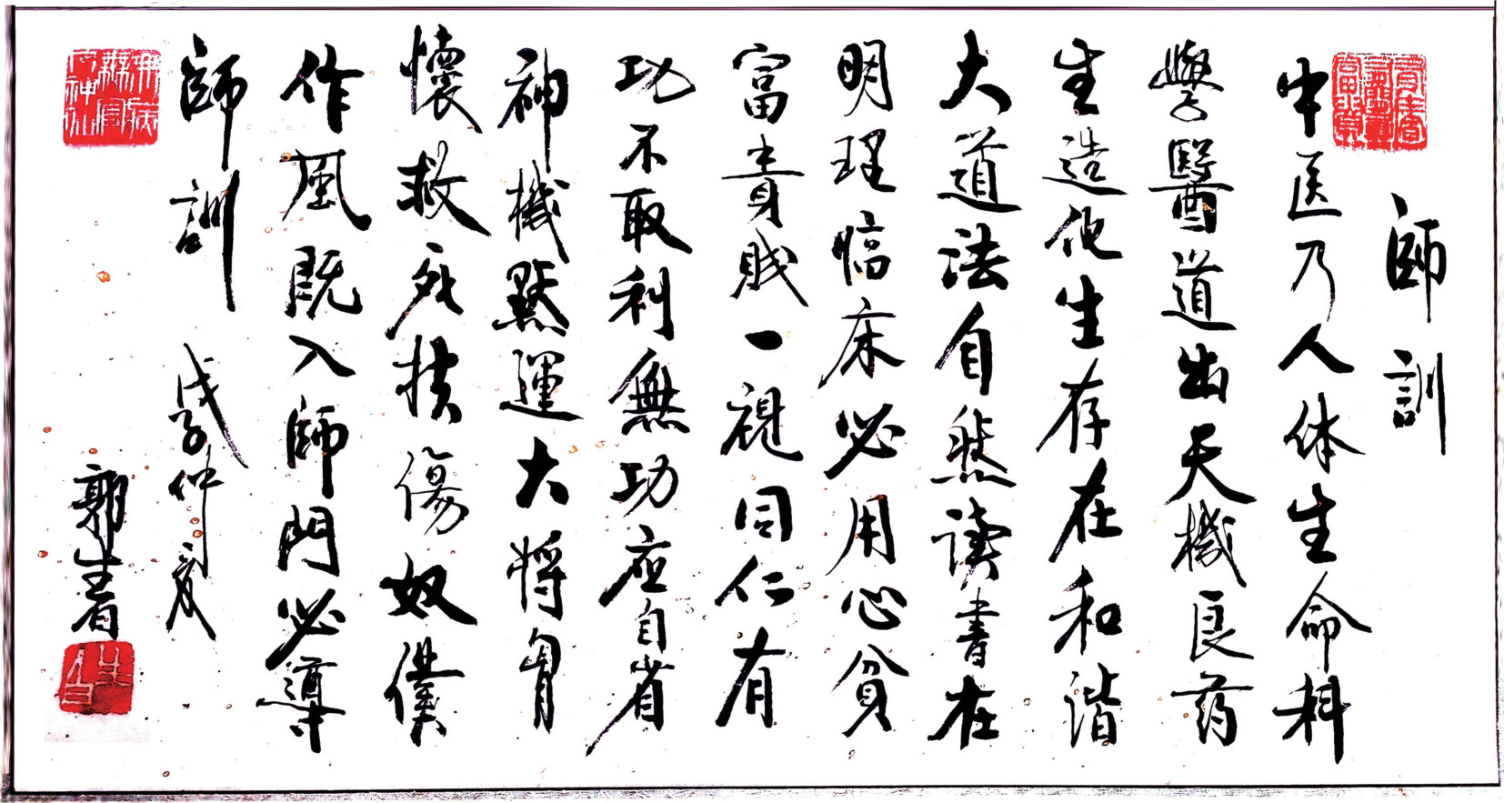 中医乃人体生命科学。医道出天机,良药生造化。生存在和谐,大道法自然。读书在明理,临床必用心。贫富贵贱一视同仁。有功不取利,无功应自省。神机默运,大将胸怀。救死扶伤,奴仆作风。既入师门,必遵师训。