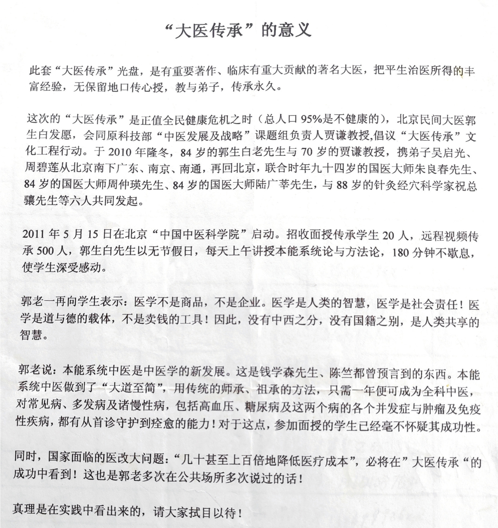 注:《郭生白大医传承实录》系列光盘分为两部分,上图所写文字为2011年第一部分整理后记录,随光盘一起置于包装盒内。