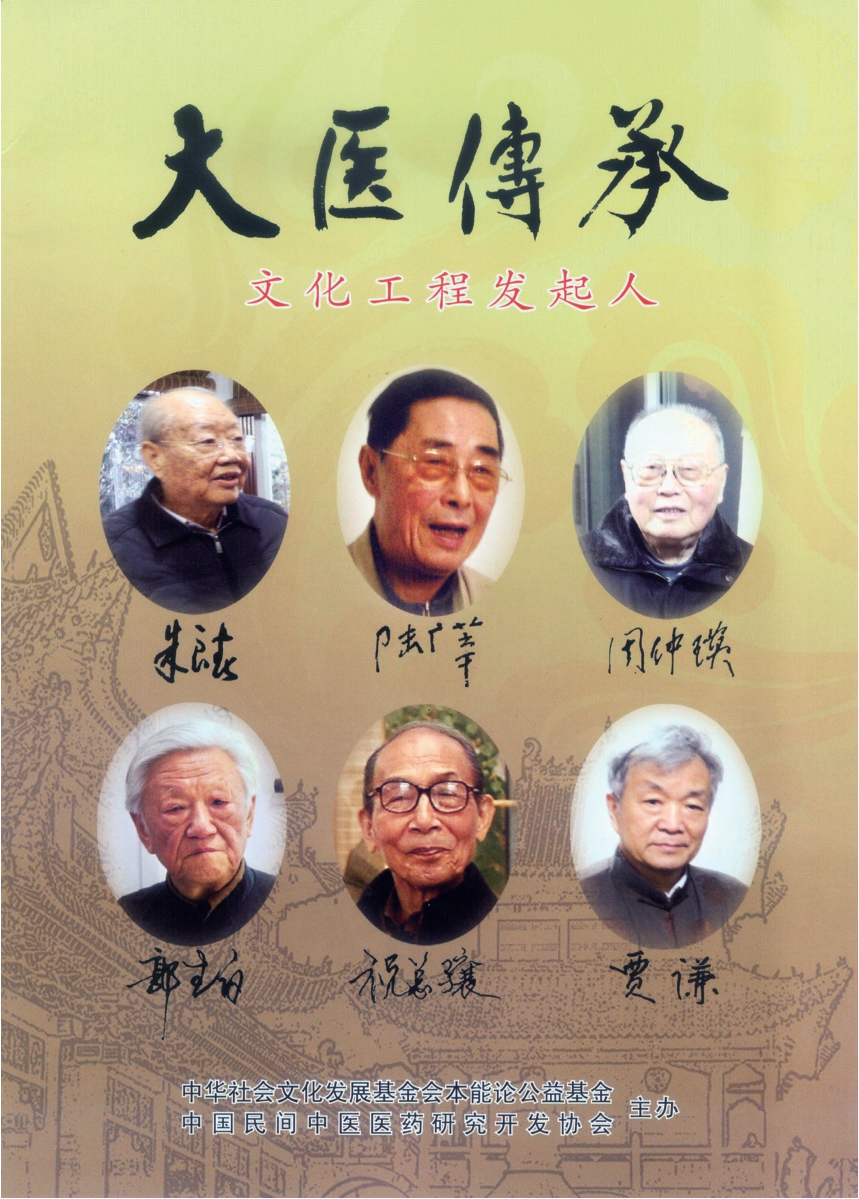 “大医传承”文化工程暨全民健康——大医传承“师带徒”公益项目是以朱良春、周仲瑛、陆广莘、郭生白、祝总骧等为代表的数位国宝级大医发起的中医文化传承项目,旨在传承中医核心文化,传播中医和谐文化及生命本能系统健康理论,提高“治未病”认识,树立全民自主本能健康信念,宣传人与自然和谐、人与人和谐、人自身和谐的理念。