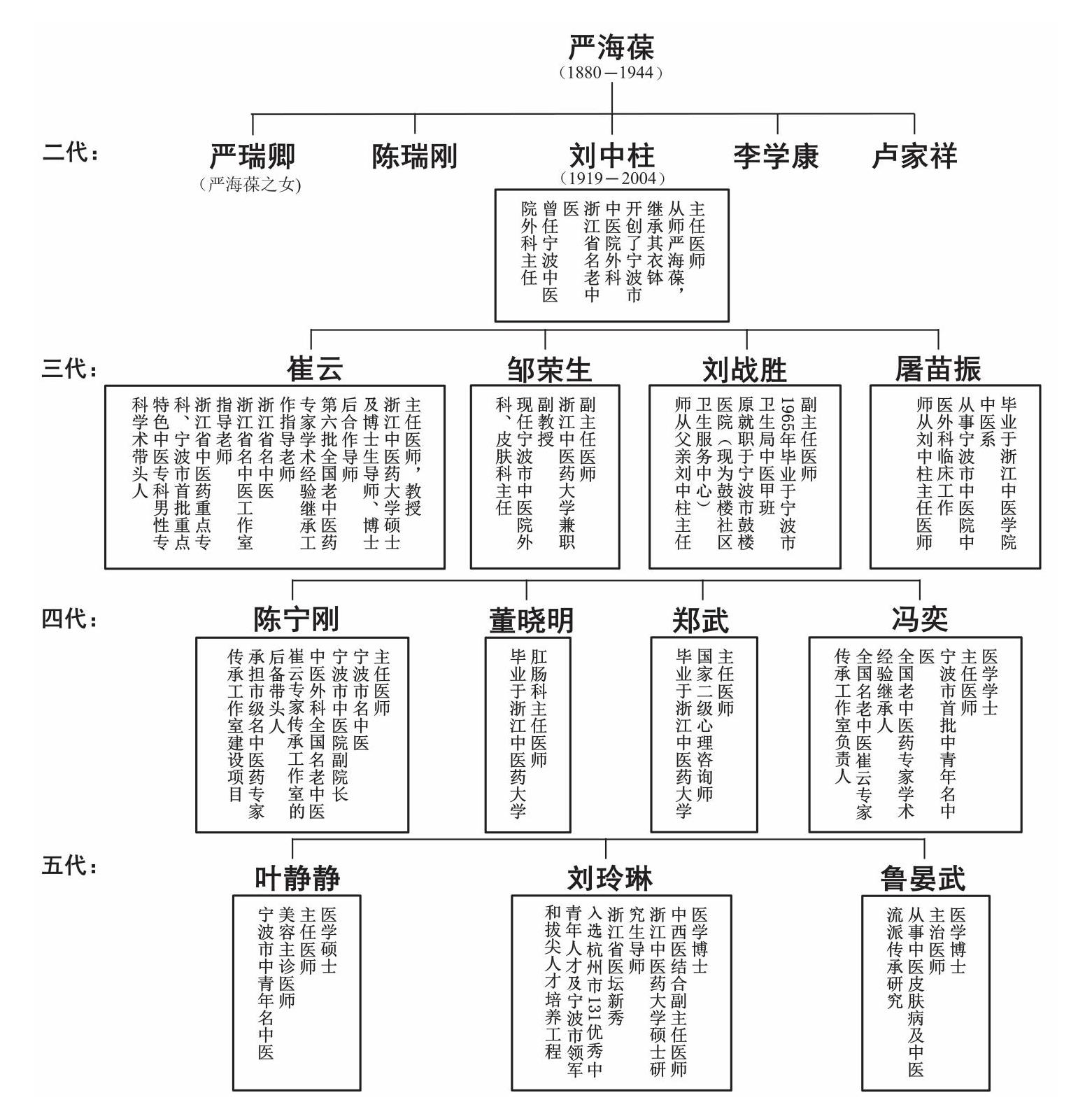严氏外科流派,肇始于清朝光绪年间的严海葆(1880—1944)。严海葆字源来,镇海县人。少时常游鄞县天童寺,遇寺内医僧大和尚,见之曰:此子有异质,聪慧过人,可教也。遂收为门徒,将生平之医学知识尤其疡科,尽传于严。逾三年,乃悬壶甬上。严氏勤奋好学,古今方药无不精研细读,与名医范文甫交往甚密,医术日精。至中年,医望甚高,求诊者门庭若市。生平慷慨好施,有口皆碑。行医四十年,积有丰富之外科经验,凡遇险重之症,每内服、外敷同时并用,即可履夷出险,转而为安。自创复方三黄膏、黄连液及蒲公英汤等验方,内服、外敷并用,颇有奇效,打造了甬派中医外科的金字招牌。严氏广栽桃李,称誉浙东,其弟子刘中柱、闻茂康、卢家祥等在宁波、上海及舟山行医。