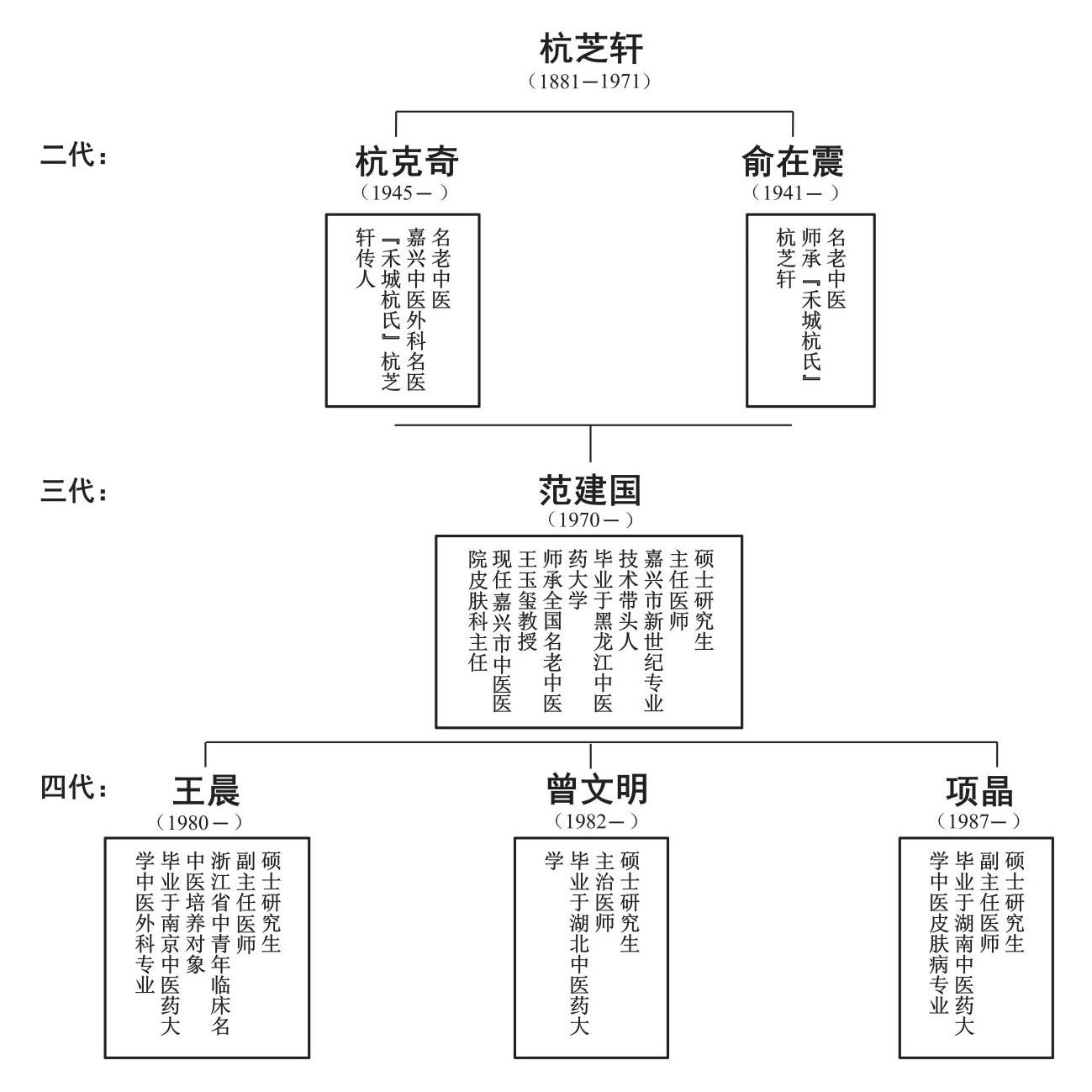 杭氏外科流派以家传、师承、现代教育相结合模式为主,形成了以杭克奇、俞在震、范建国为主要代表人物的杭氏外科流派传承脉络。杭氏外科,在嘉兴地区及江苏吴江地区都具有一定的影响力,均有慕名而来就诊的患者。