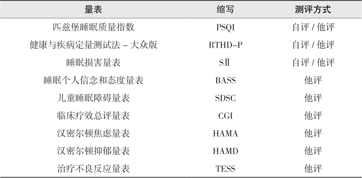 症状量表可分为自评量表和他评量表两类,自评量表主要反映就诊者主观感受到的症状严重程度,他评量表则反映客观评价的症状严重程度。由于失眠者一般有自知力障碍,有求治欲,所以,比较适合采用方便省力的自评量表。如果能将自评和他评相结合,则避免就诊者的主观加重诉述病情的倾向,较准确地评估症状严重程度。症状量表可作为疾病的一般资料,评估有无靶症状及其程度,如定期随访测定可作病情变化的监测指标及反映疗效的指标。常用量表见表4-1。