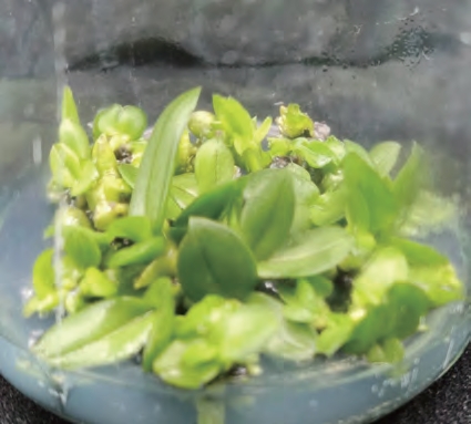 在1/2 MS+1.0 mg/L 6-BA+1.0 mg/L NAA+1.0 mg/L AC+5.0 g/L琼脂+30.0 g/L蔗糖的培养基上对多花脆兰进行丛生芽增殖培养,培养基pH为5.8。培养25 d后,开始分化出丛生芽,培养30 d后,不定芽增殖系数8~10。