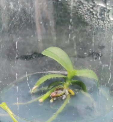 挑选生长状态良好的多花脆兰带根组培苗移入常温室内,拧松组培苗盖子放置3 d,再掀开盖子放置4 d,将组培苗从瓶内取出,洗掉根部附着的培养基,移入湿润的兰石:苔藓:腐熟松树皮=1:2:3的基质上培养。培养温度20~25℃为宜,遮阳率30%~50%。移栽30 d后,多花脆兰组培苗成活率为90%左右。