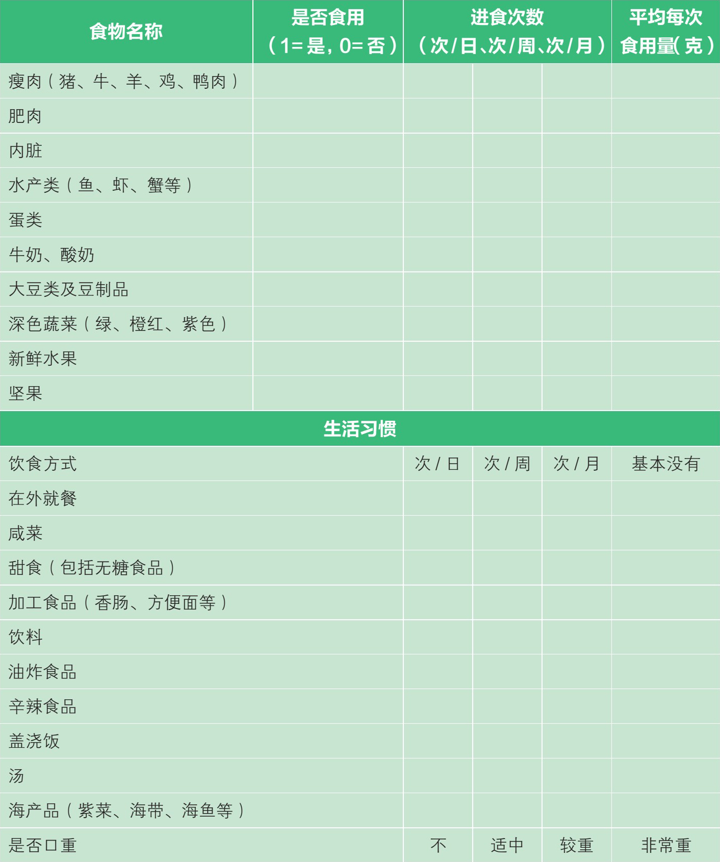 2. 频率和平均一次的摄入量都是估算,不可能十分准确,也不可能每一次吃的饭量都一样。但是要相信习惯的力量,大多数情况下,每一次就餐所盛的饭菜量相差不会太大。
